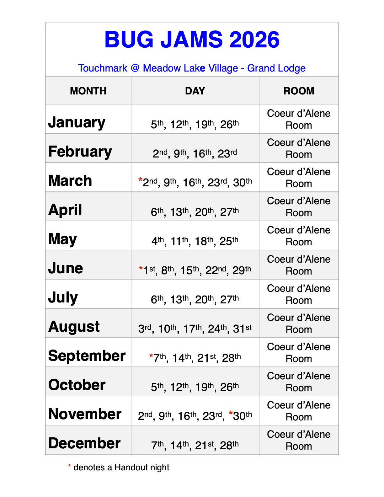 BUG Jams are held from 6:15 to 8:00 in the evening on each Monday of the month inside the Main Lodge at Touchmark at Meadow Lake Village.